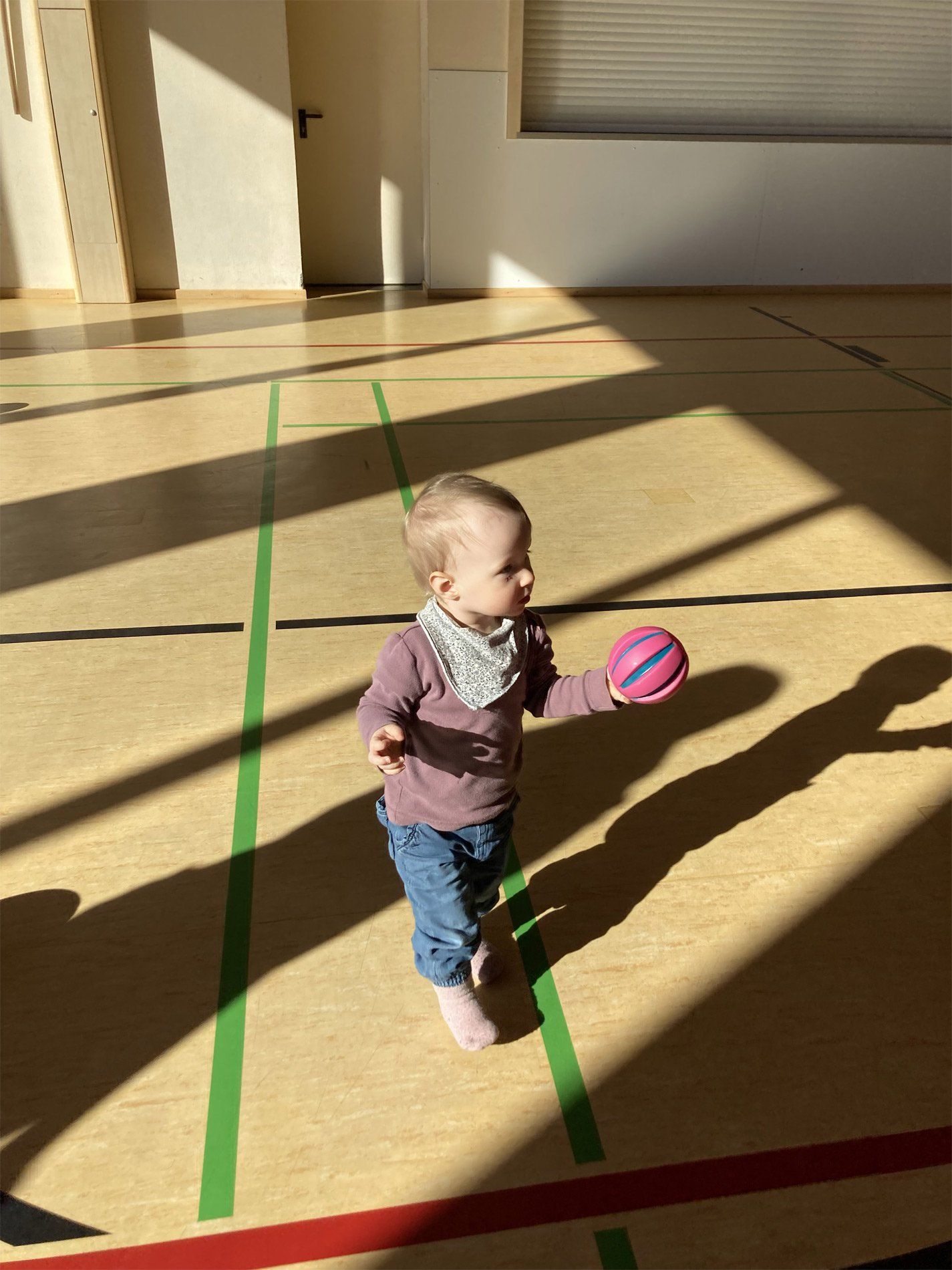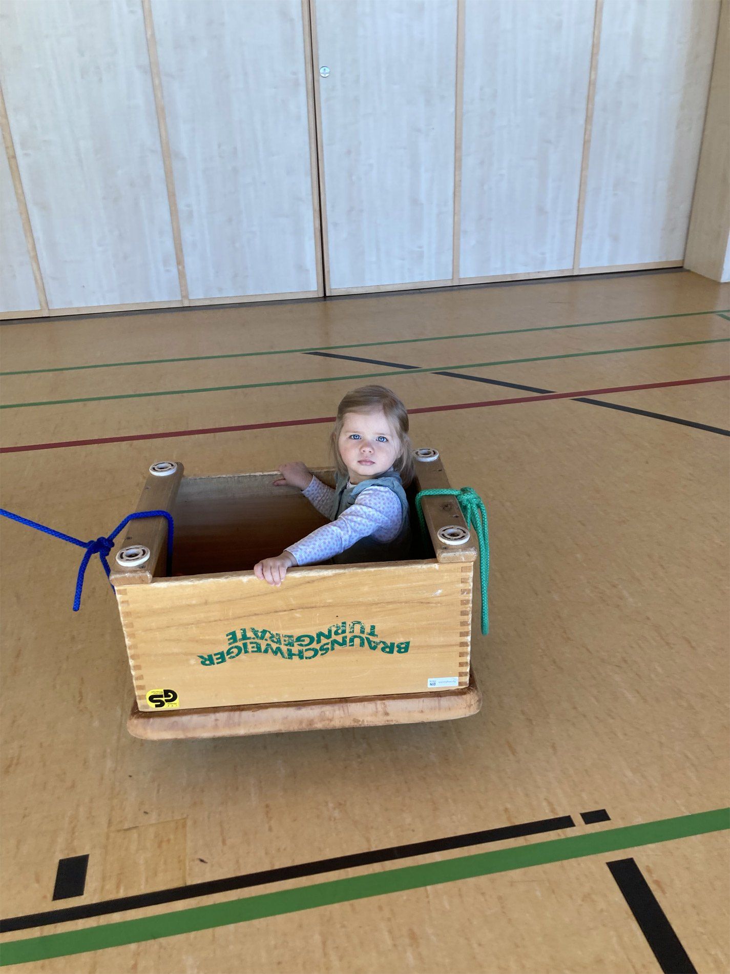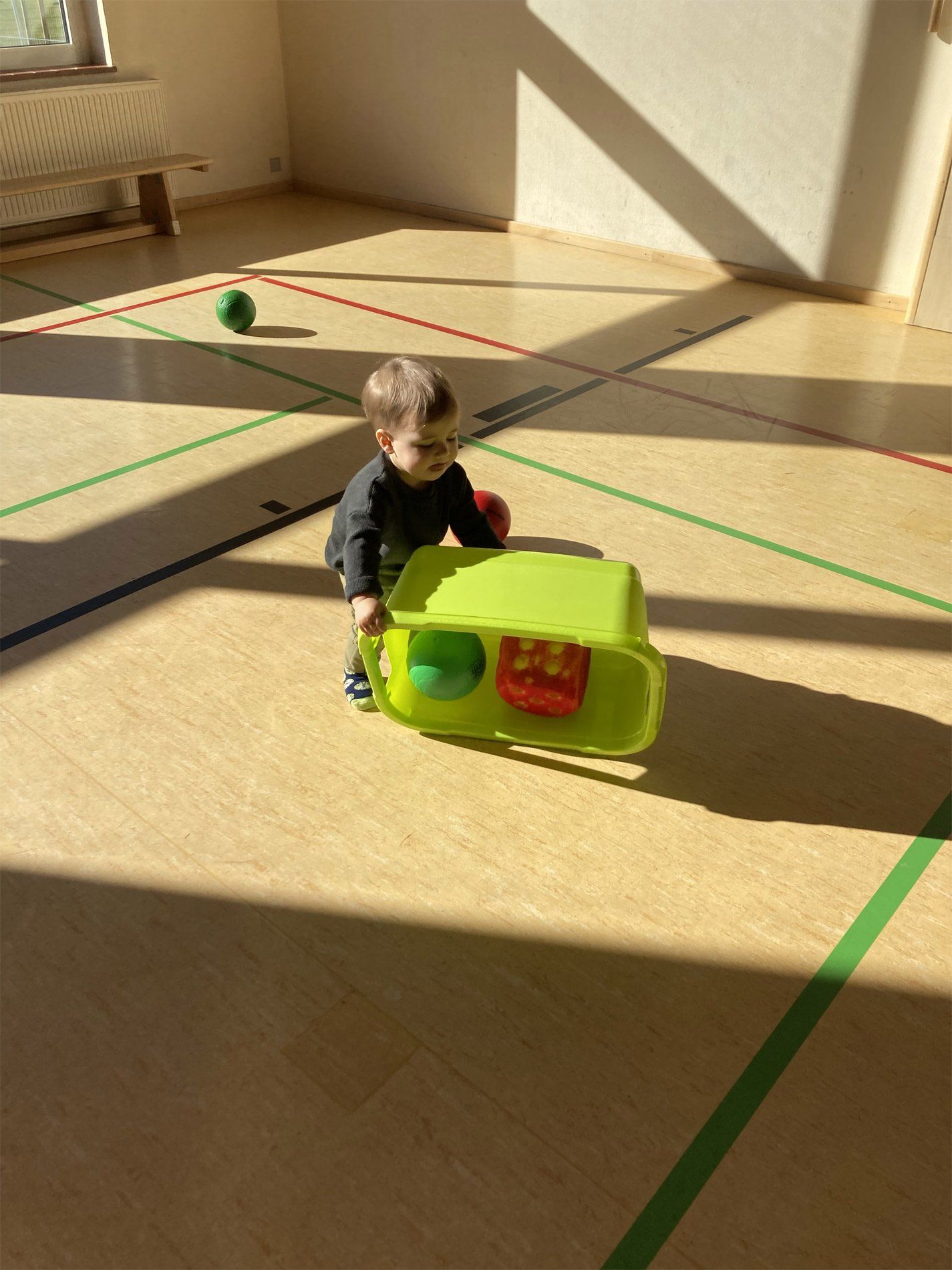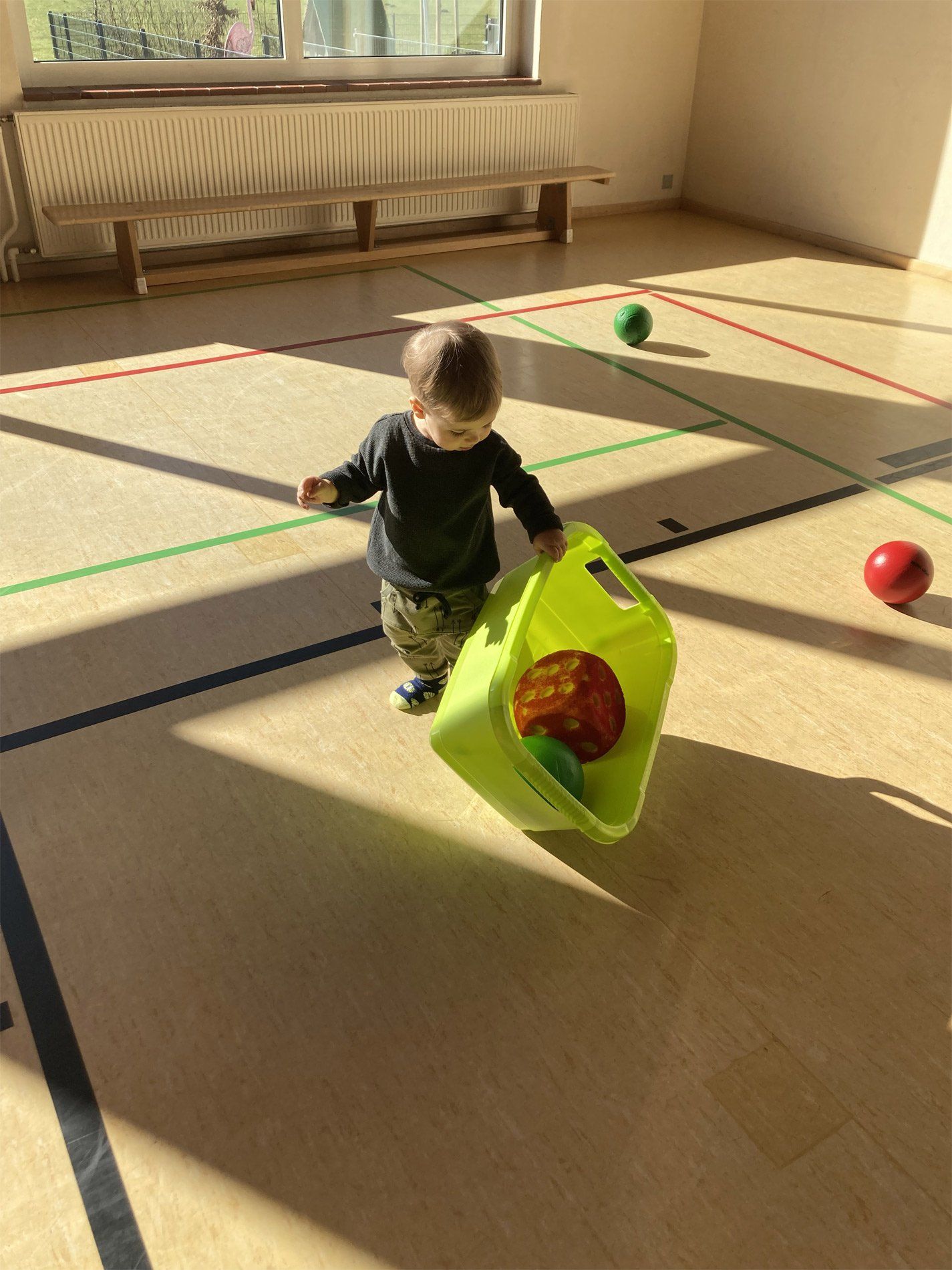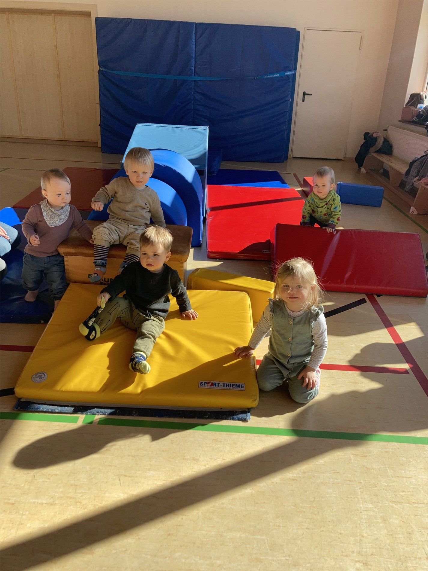 Wir spielen mit Bällen, wir singen Lieder, wir laufen durch die Halle, wir klettern über Geräte, wir krabbeln durch Tunnel, wir schaukeln, wir fahren in Kästen auf Rollbrettern, wir springen auf Matten. Die Kinder sammeln dabei positive emotionale und soziale Erfahrungen, indem sie in ihrem eigenen Tempo ohne Leistungsdruck spielerisch ihre Fähigkeiten erproben und voneinander lernen.